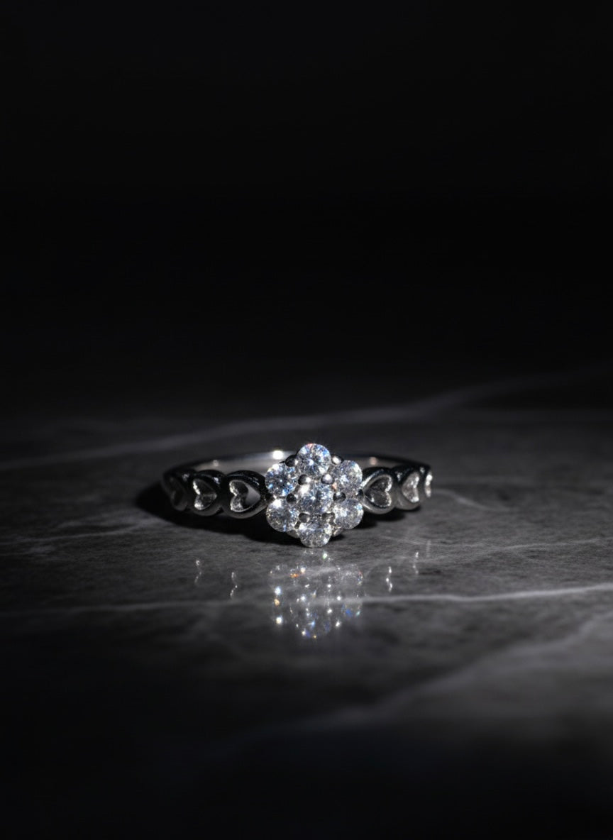 This is a lovely ring crafted from 925 sterling silver. It features a beautiful cluster of small, clear stones at its center, arranged to resemble a delicate flower. The band of the ring is adorned with a pattern of interconnected hearts, adding a sweet and romantic touch. It's a simple yet elegant piece, perfect for everyday wear or as a thoughtful gift.